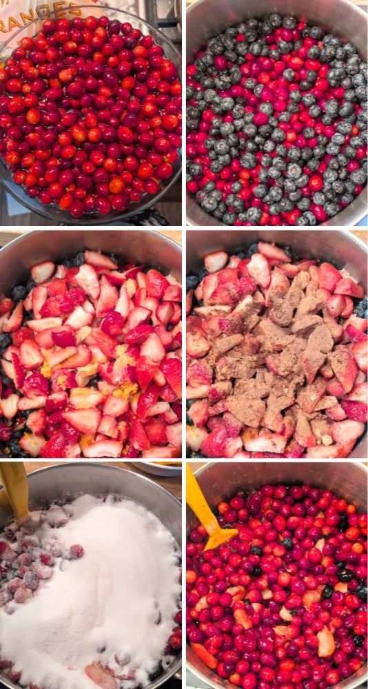 - Load the pot. In a very large (at least a 10 quart pot), heavy-bottomed stock pot, add the cranberries, strawberries, blueberries, orange juice, orange zest, spices and sugar.